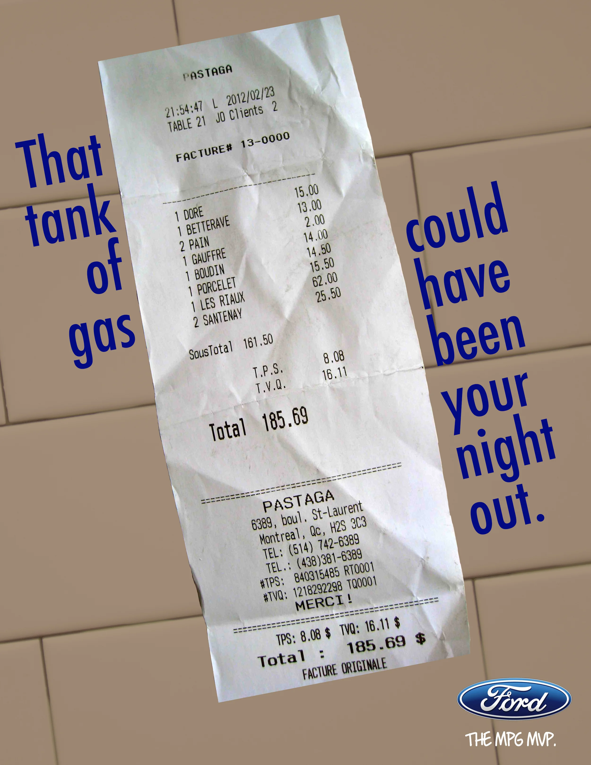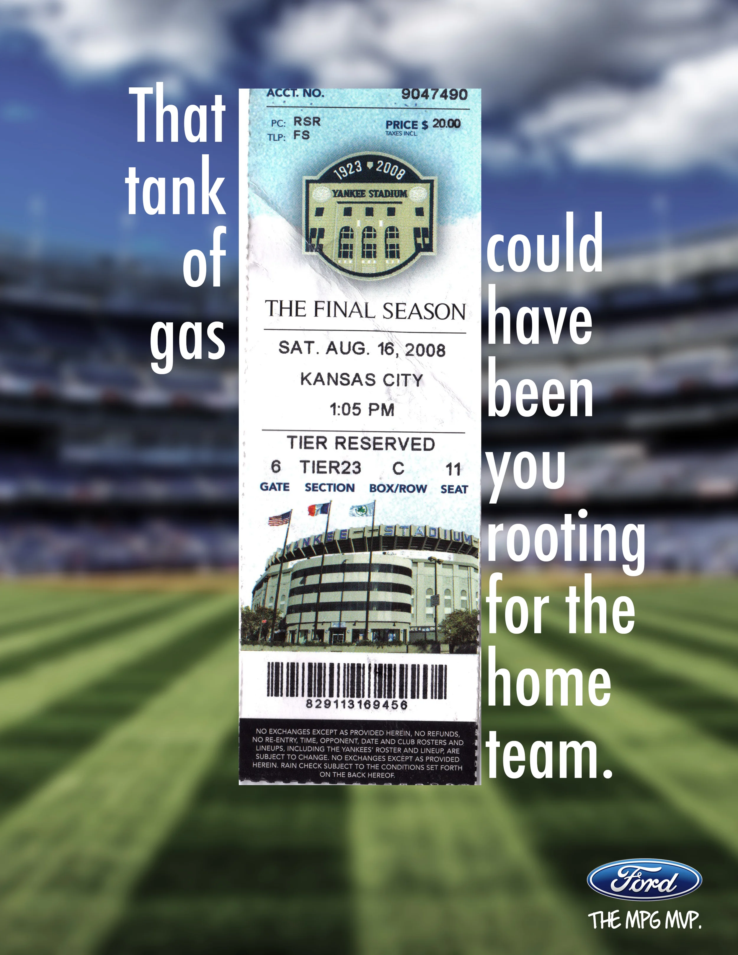 For Ford, I took a look at their recent advertising and saw that lately, they’ve been emphasizing how good their gas mileage is. This led me to the tag-line of “The MPG MVP” and it was the inspiration behind this campaign. In this campaign, I wanted to show how much money people are wasting on gas and how much better it could have been spent.